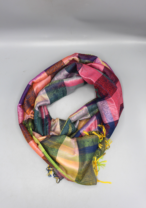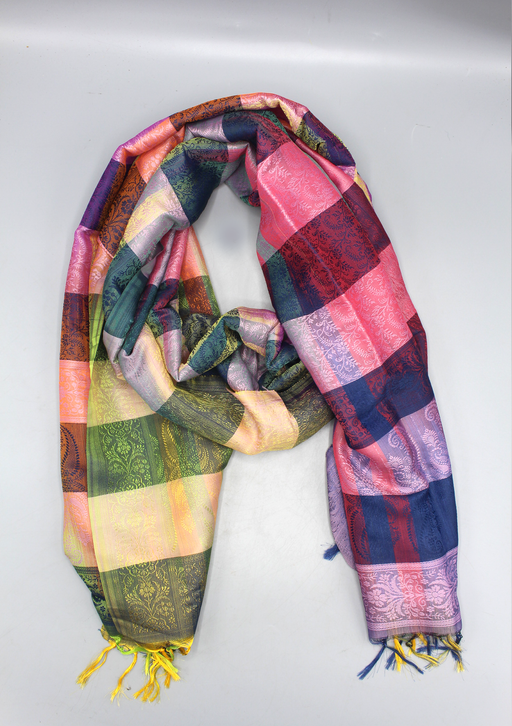 Silk Mixed Polyester Pink and Green Mixed Multi Color Shawls with Furka