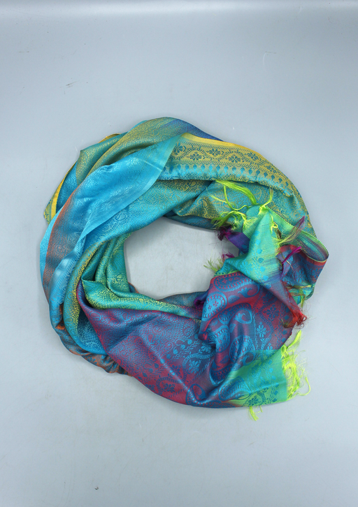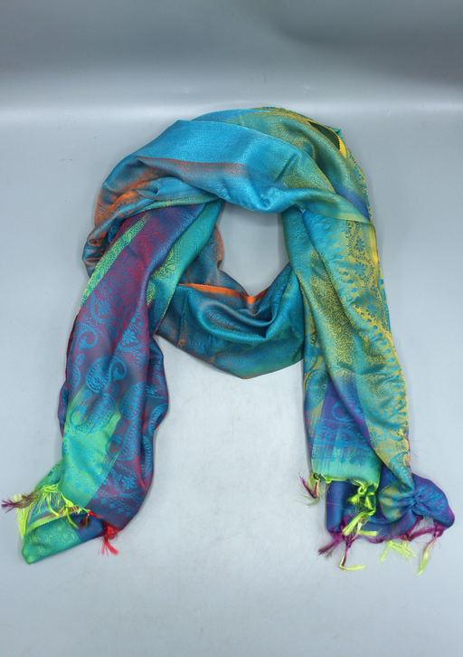 This is a silk mixed polyester vibrant multi color shawl with furka handmade in Nepal. The shawl is smooth to the touch and very light weight to c...