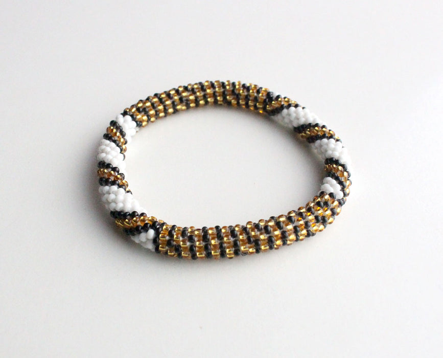 Our woman artist carefully hand-strung this fairly traded roll on bracelet. Made with the finest quality Czech and Japanese beads, the bracelet stretches as you roll it over your wrist. It fits most wrists as it is adjustable and will roll over around your wrist.