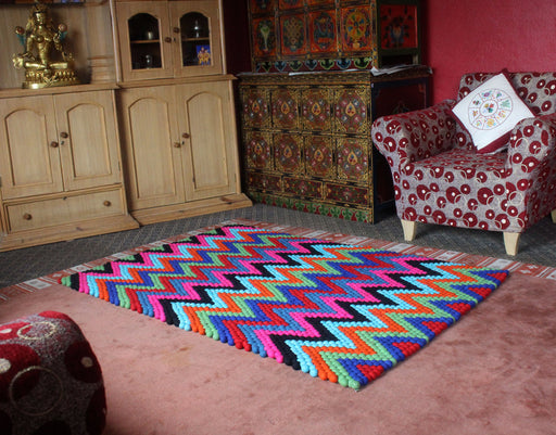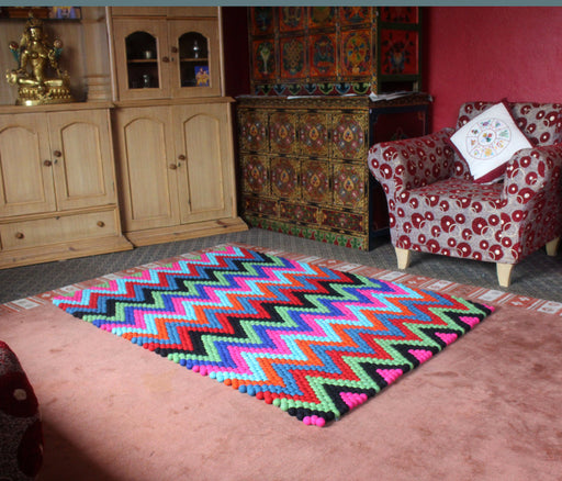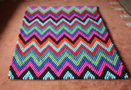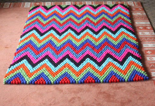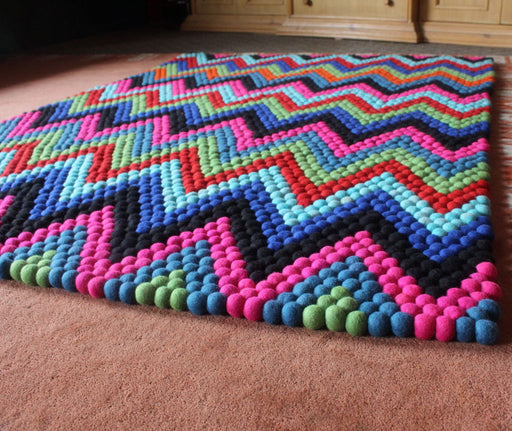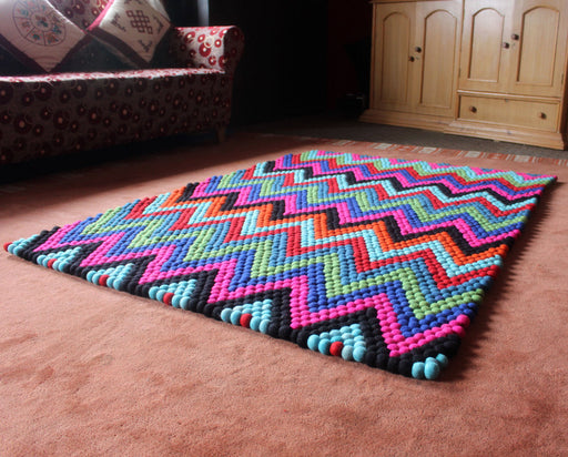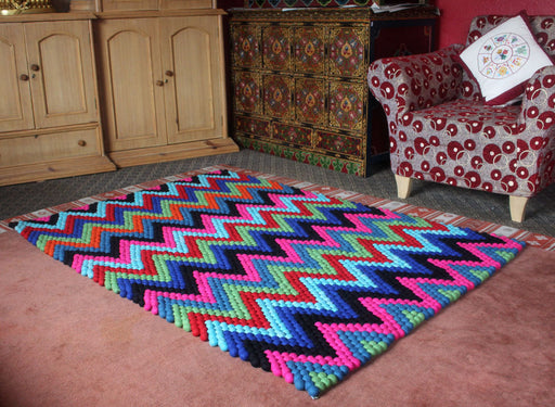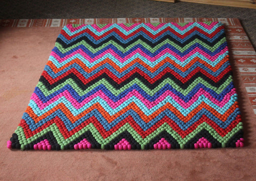Felt Ball Rectangular Multicolor Zig Zag Pattern Rug This is a wonderfully colorful zig zag patterned rectangular felt rug. Our women artists firs...