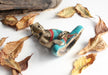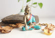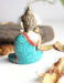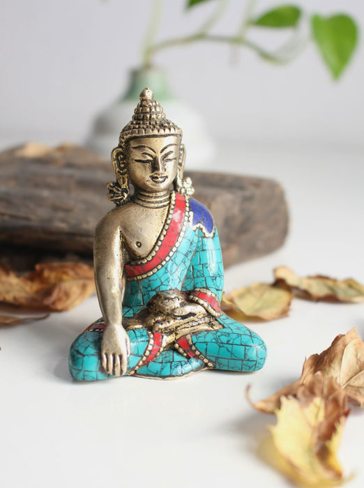 This is a Brass Shakyamuni Buddha Statue with a majestic robe made of faux Turquoise, Coral and Lapis Chips. This statue is 3" high and portraits Shakyamuni Buddha in a dhyana asana(meditative pose).
