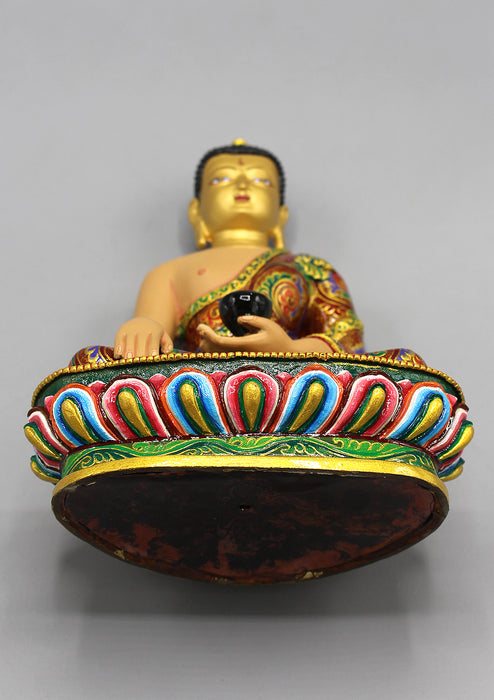 Shakyamuni Buddha is seated in Dhyana Asana or Meditative Pose, also called Padmasana. In this position, the legs are crossed, closely locked with the soles of both feet visible. Shakyamuni Buddha is seated on lotus beautifully painted.