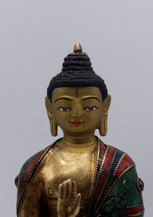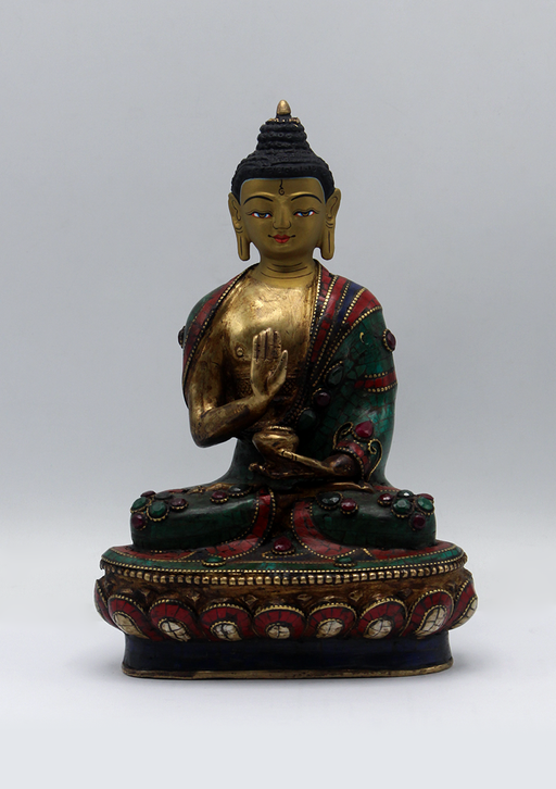 View full detailsStone Inlaid Copper Amogasiddhi Buddha Statue 8.5"H