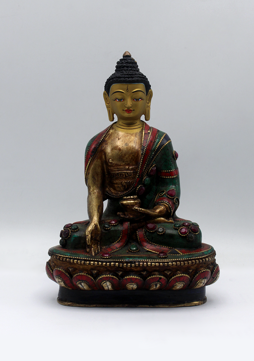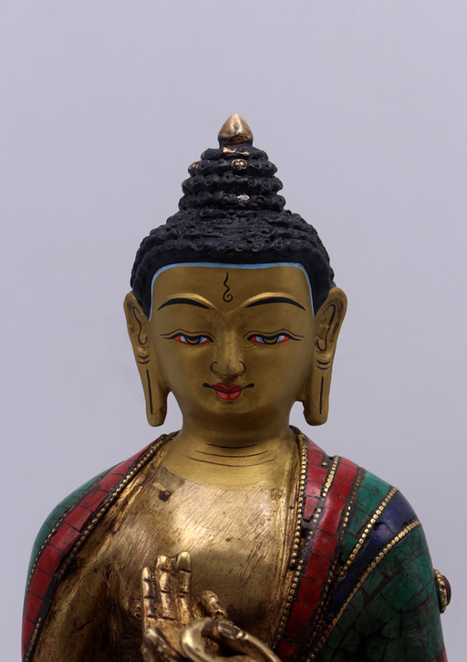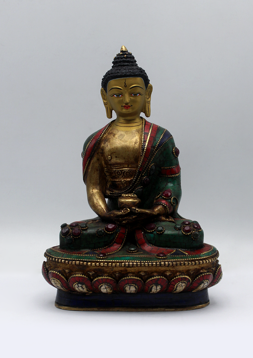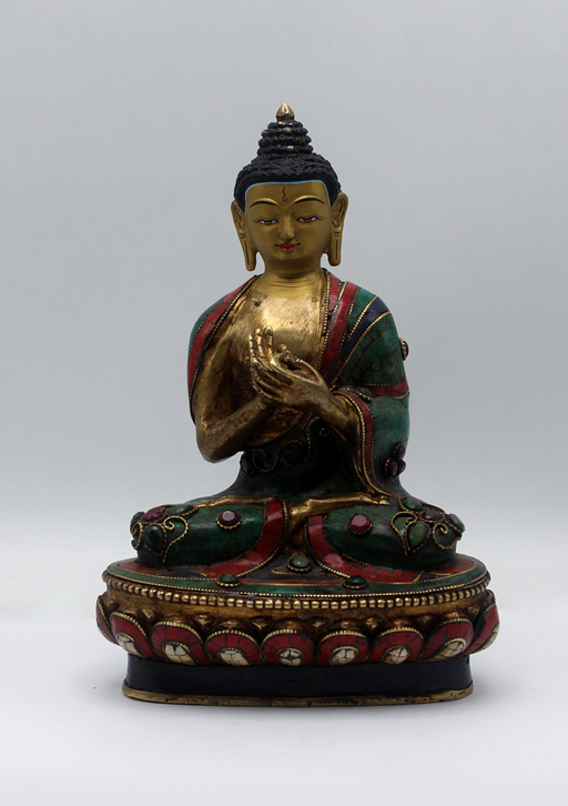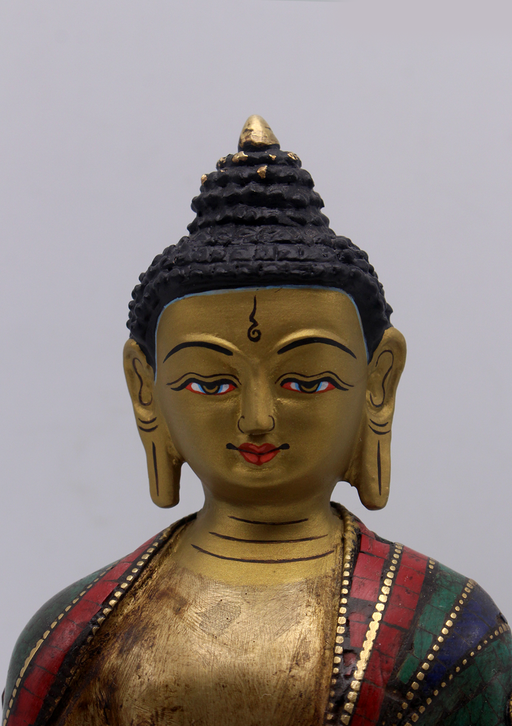 This is a Brass Shakyamuni Buddha Statue with a majestic robe made of faux Turquoise, Coral and Lapis Chips. This statue is 3" high and portraits S...