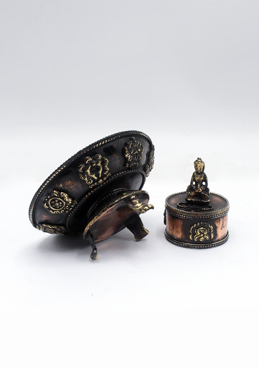 This is a beautiful half box design Copper incense burner with Tibetan Om Mani mantra. The incense burner has four legs to stand on. A Buddha penda...