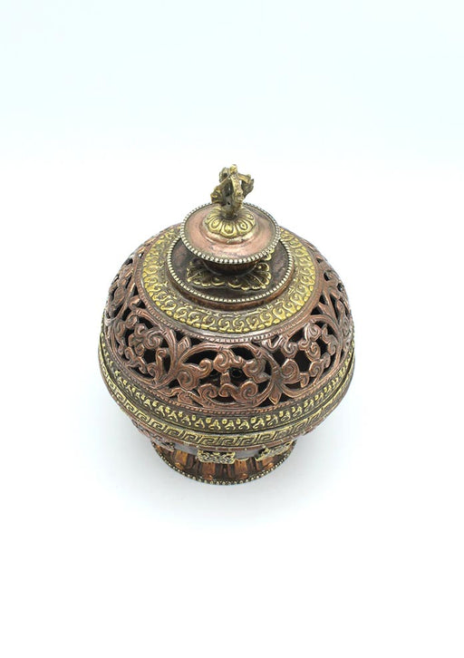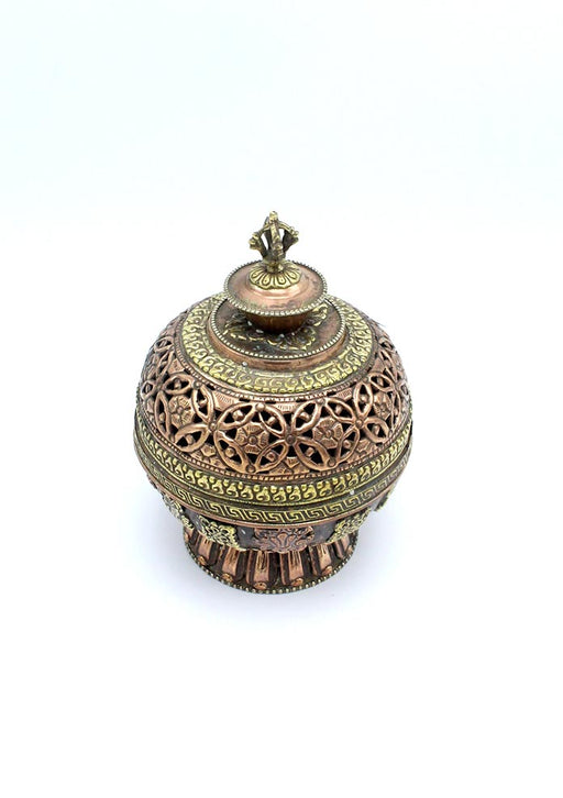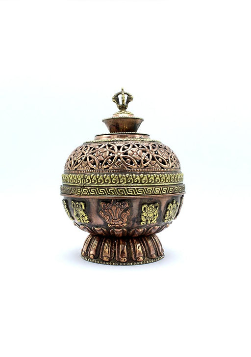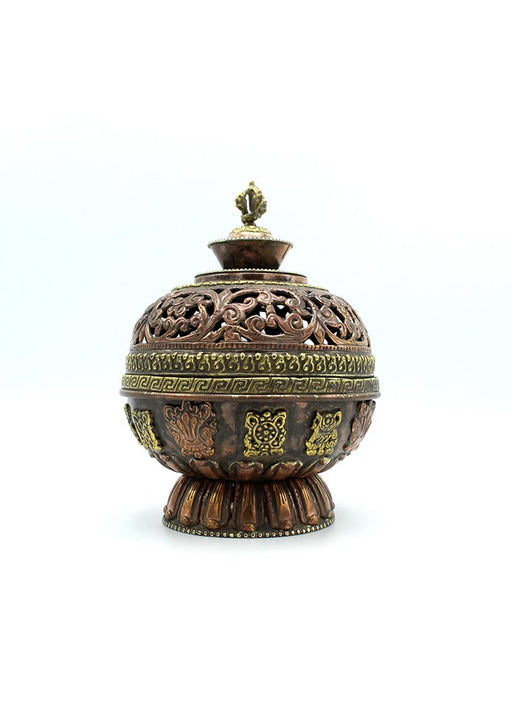 This is a unique round copper astamangal incense burner with floral design on the top lid an a lotus base. Beautifully crafted with various symbols...