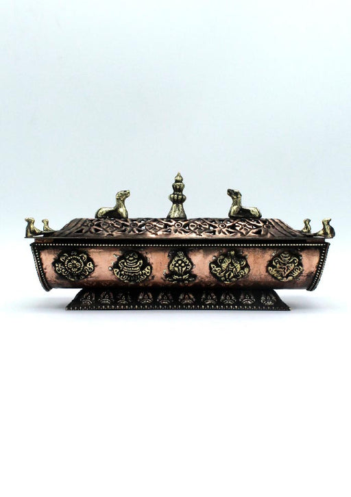 This beautiful rectangular Tibetan Incense Holder box is hand crafted by our artisans in Kathmandu Nepal. This is made of Copper. This is a singula...
