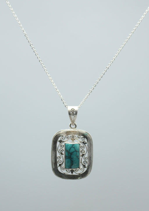 This is a handmade silver sterling pendant with a turquoise.The silver pendant has floral motif carving and has a shiny turquoise embedded in it. T...