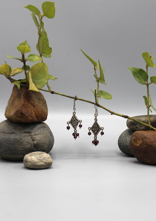 This earrings is finely hand carved in Nepal by our artist. The earrings are carved into a shaped of tear drop and inlaid beautifully with Garnet ...