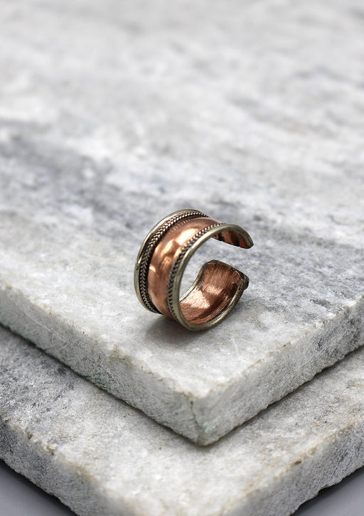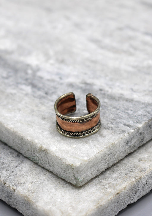 This is a very popular copper finger ring handmade in Nepal. The ring is made from copper. The border of the ring has fine white metal carving bord...