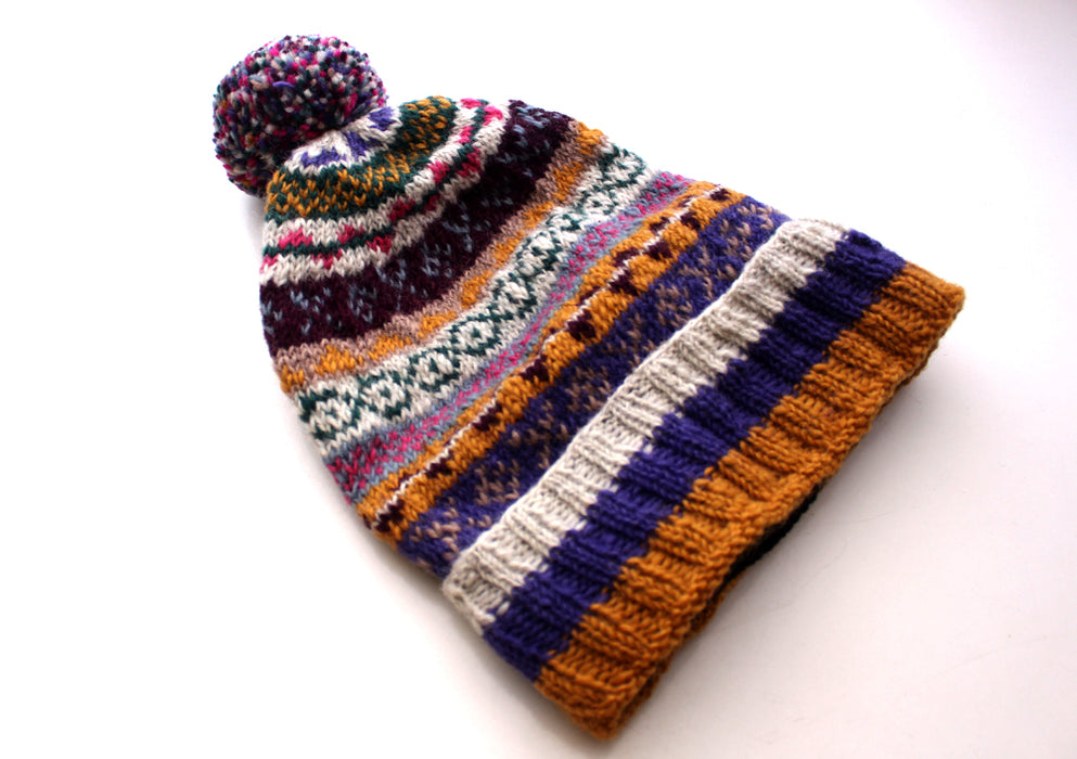 Hand Knit 100% Woolen Yellow, Blue and Pink Multicolored Sherpa Pom Pom Beanie