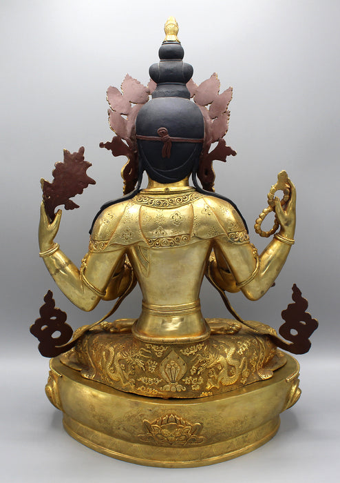 This is a masterpiece statue of Chenrezig skillfully crafted by our fourth generation artist. This 19 inch high statue is fully gold plated and has the most intricate and detailed carvings. The carvings on the robe through out the lower part is unmatched. The carvings of Double Dragon, Cheppu and floral motifs add more glory to this beautiful and powerful statue.