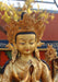 The two hands of the Chenrezig is folded in the posture of Namaste and the other two hands are raised close to the shoulders holding lotus and garland in an infinite loop. The crown covers the head and flows down to the neckline. Two big floral earrings are pierced in the ears which elongates down the shoulders. The Chenrezig is seated in the EK Padma or Single Lotus.