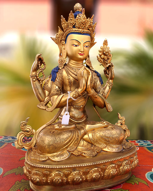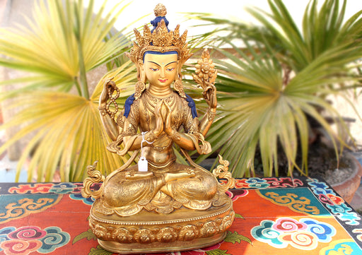 This is a masterpiece statue of Chenrezig skillfully crafted by our fourth generation artist. This 13 inch high statue is gold plated and has the m...
