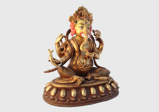 This Ganesha Statue is made of copper and partly gold plated. Standing at 6 inches tall, Ganesha here is depicted as sitting on a single lotus. Wit...
