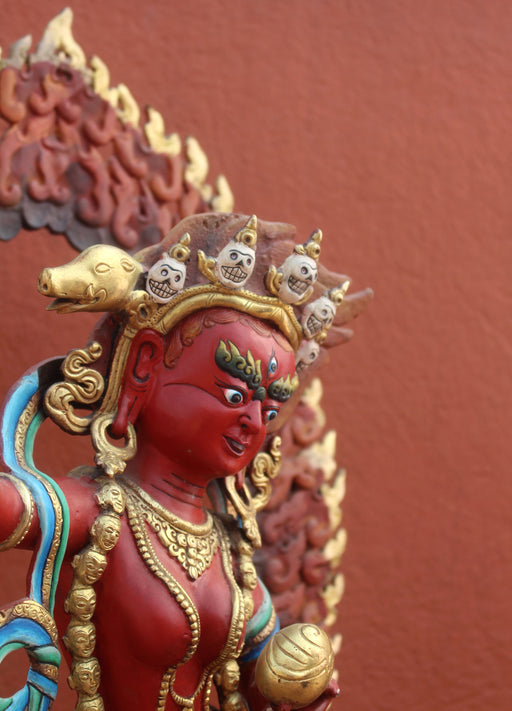 This is a masterpiece statue of Yogini which is gold plated and red painted. The Yogini statue is powerfully depicted as she adorns a human skull m...
