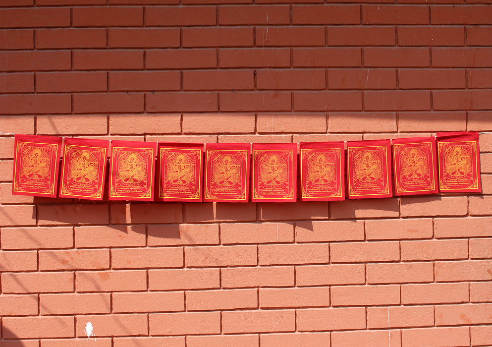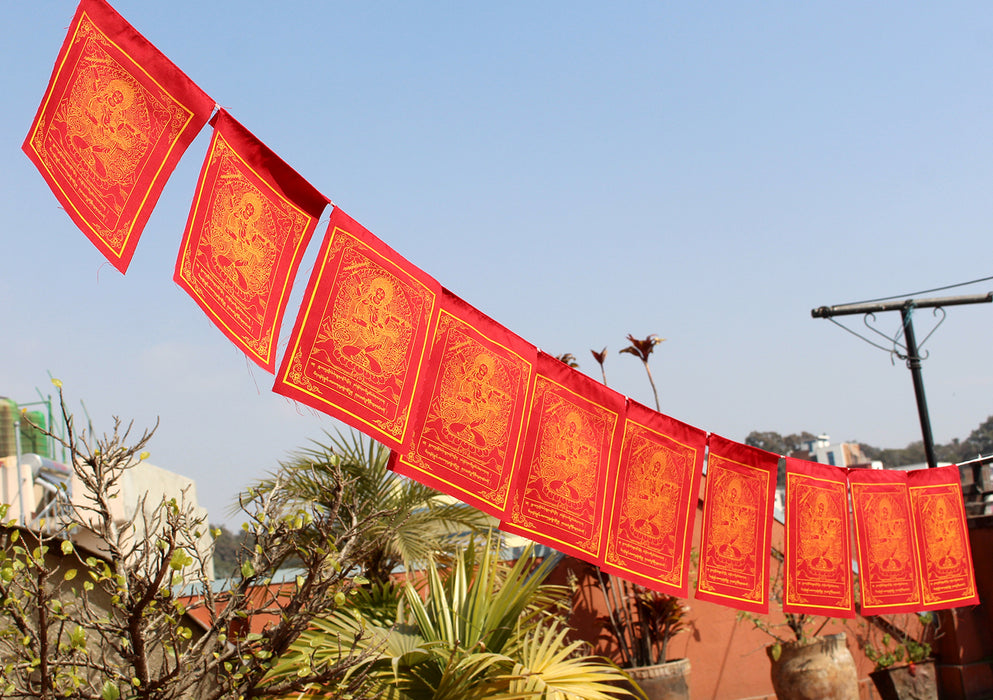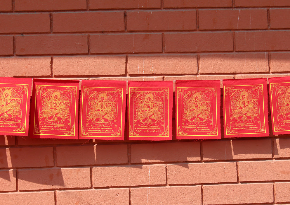 These are all red Kurukulla or Kurukulle Prayer flags. The red terry cotton fabric is screen printed with yellow ink. The image of the female yidam Kukukulle is prominently pictured on the prayer flag along with the mantra text at the bottom.