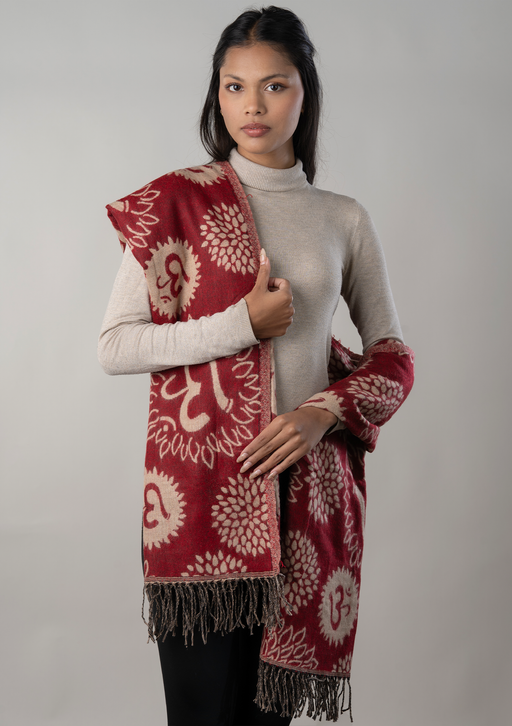 Soft, lightweight, and handwoven in Nepal, this Om patterned wool shawl is designed to provide natural warmth while carrying a quiet spiritual pres...