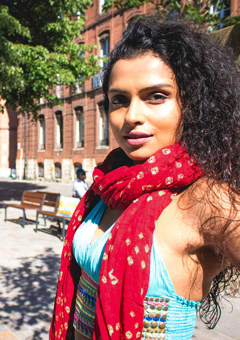 This Maroon Red cotton scarf is hand tie dyed with natural colors in Nepal. The fabric is soft and lightweight. It can be worn with any dresses.