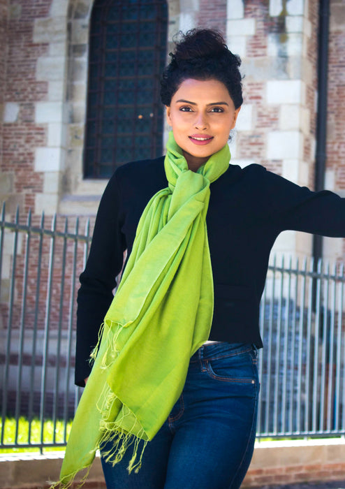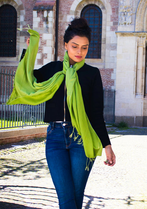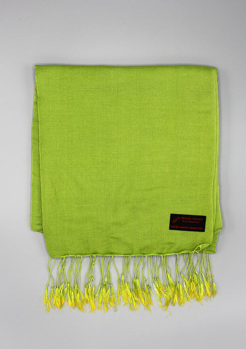 This water pashmina shawl is in pepper stem green color that is relaxing and restful to eyes. The green color is always in fashion. This green color shawls goes well with the White, Red, Pink and even black dresses. This green water pashmina shawl is a perfect accessories for this summer.