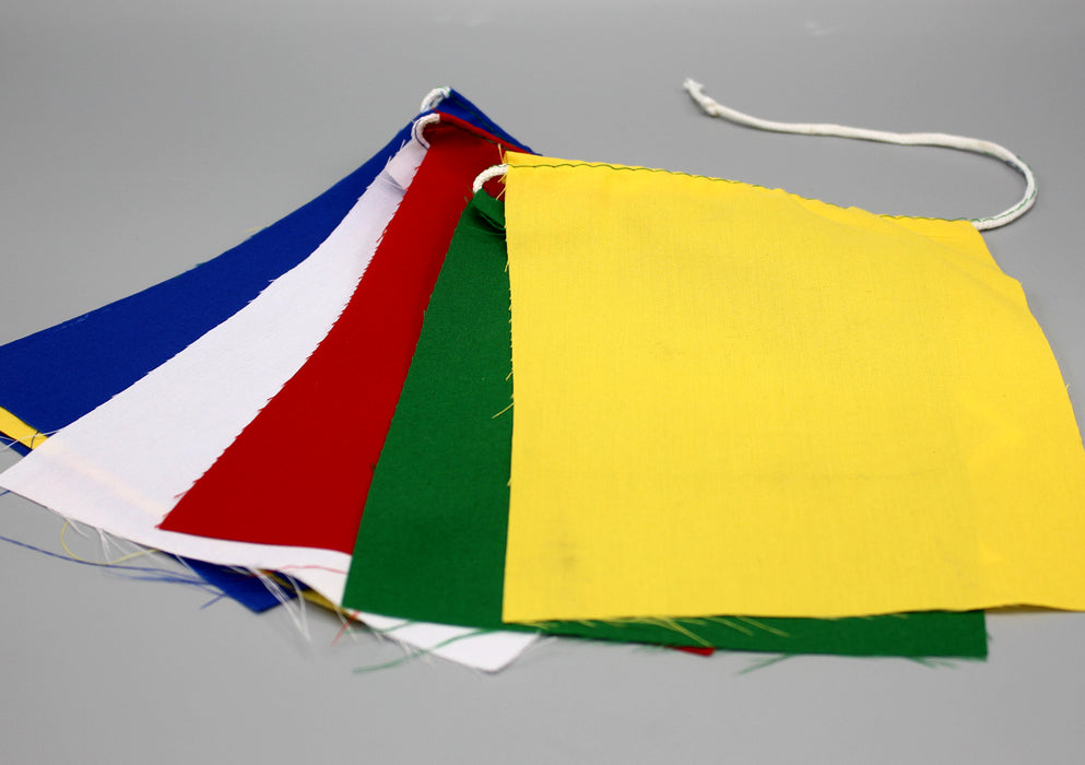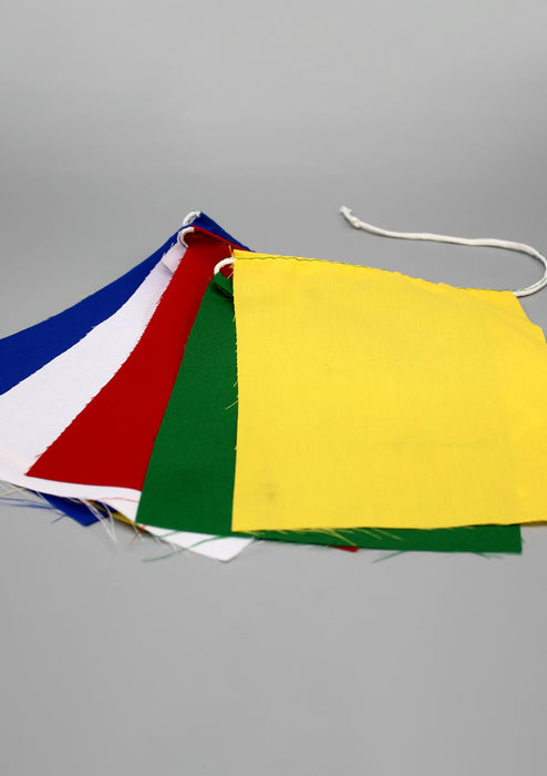 Prayer flags are very popular in Tibetan Buddhism. This blank prayer flag is handmade in Nepal. The prayer flags has five color representing five elements. Blue flags symbolize the elements sky or wind, white flags stand for the element of air, red flags indicative of fire, green color stand for water and nature and yellow symbolize earth.