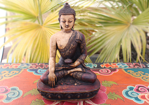This is a handmade Resin Medicine Buddha statue. The statue is painted with beautiful flower over the body. A dye is created by our master sculptor...