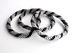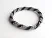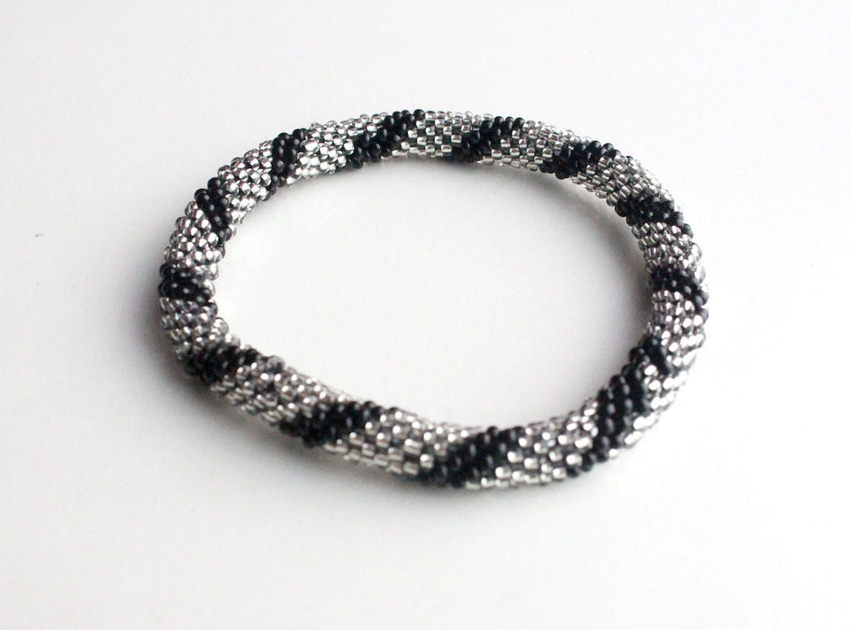 Hand Crocheted Silver Black Roll On Bracelet. Our woman artist carefully hand-strung this fairly traded roll on bracelet. Made with the finest quality Czech and Japanese beads, the bracelet stretches as you roll it over your wrist. It fits most wrists as it is adjustable and will roll over around your wrist.