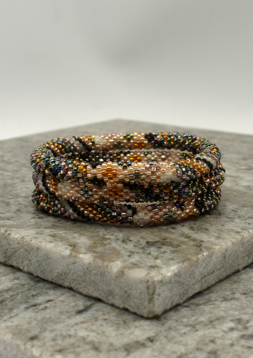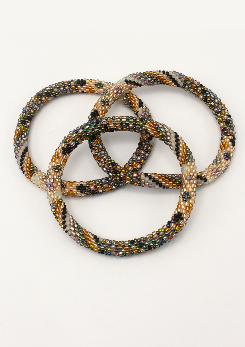 These fairly traded glass beads bracelet are meticulously crocheted by our women artists. Our woman artist carefully hand-strung these Roll On bracelet to give them the best shape and design.