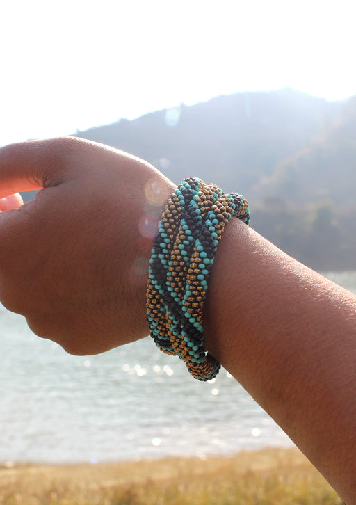Mint Green and Yellow Spiral Nepalese Roll On Bracelet has been meticulously crocheted by our women artists. Our women artists have carefully hand...