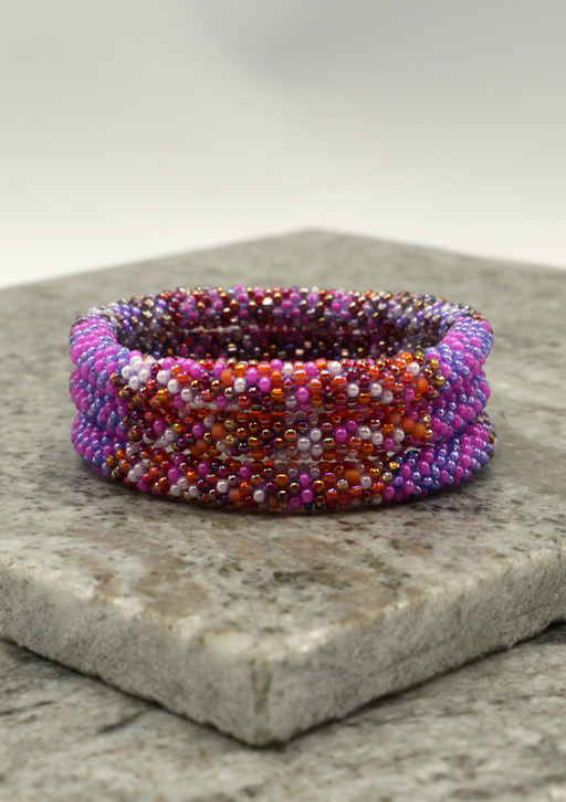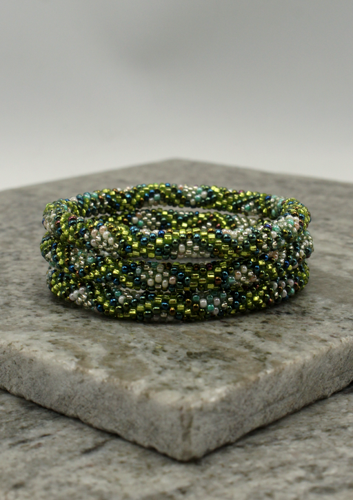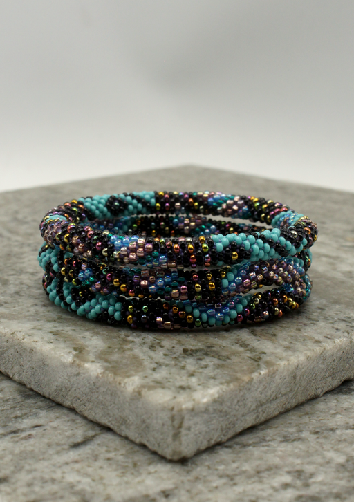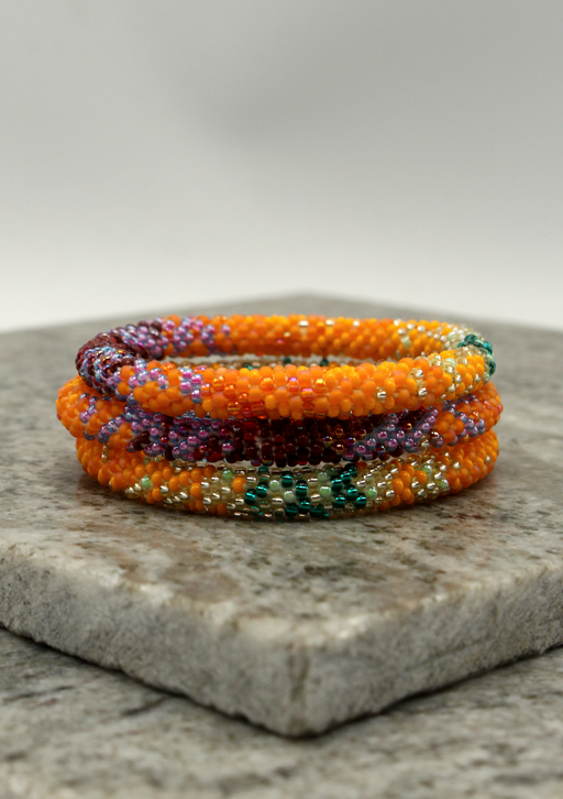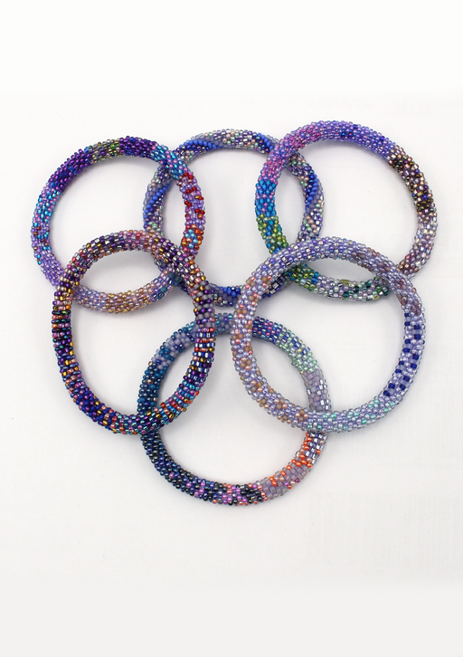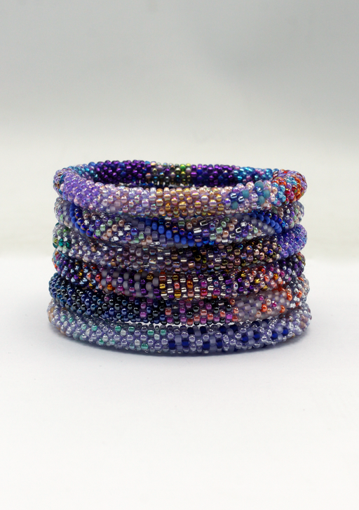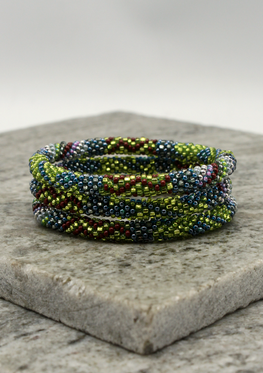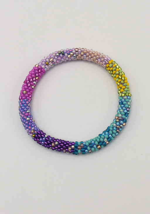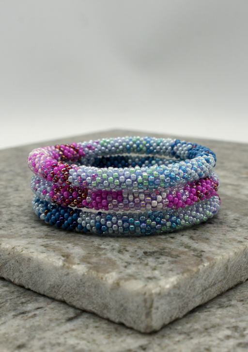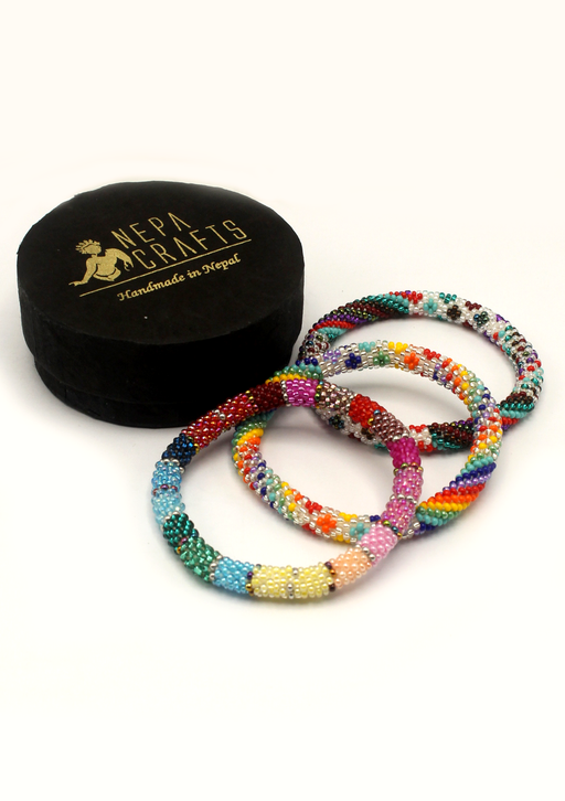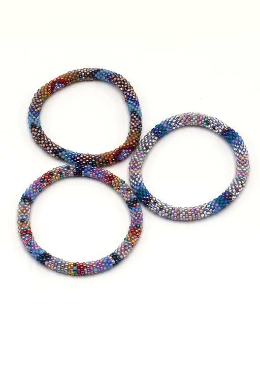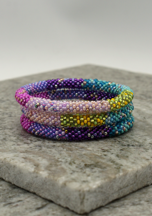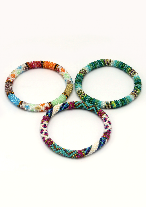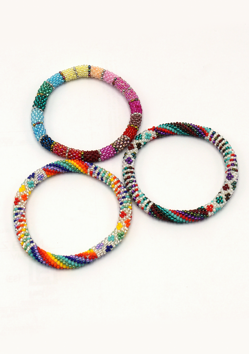 Our Roll Beads Bracelets are beautifully hand-crocheted by skilled women artisans in Nepal using high-quality glass beads. Designed to roll easily over any wrist size, these bracelets are both stylish and comfortable. Perfect for stacking or wearing alone, they add a vibrant, handcrafted touch to any outfit.
