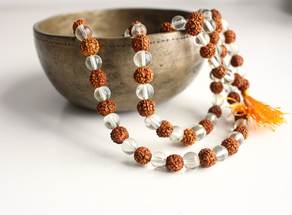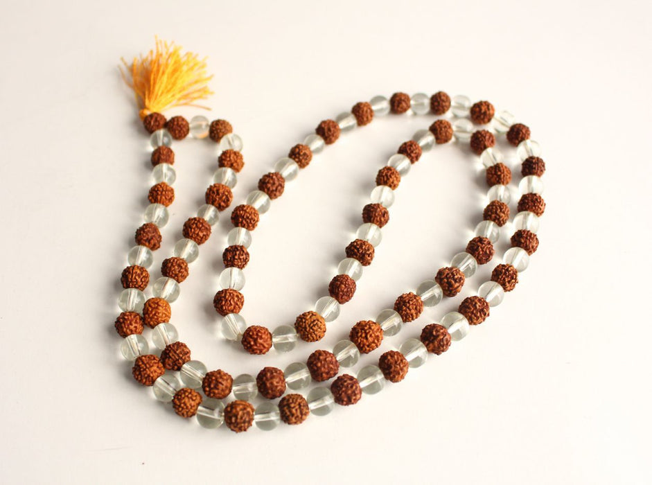 This is a powerful 8mm Rudraksha beads mala decorated by quartz crystal beads. The mala has 108 beads and one rudraksha bead as center bead or guru bead.