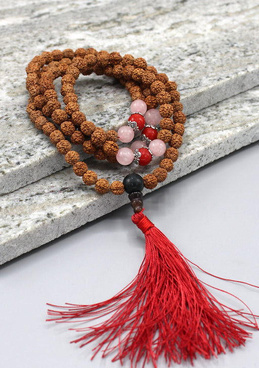 This is a Rudraksha seeds prayer mala from Nepal. The mala contains 108 Rudraksha beads with coral and rose quartz spacer. Rudrakshya is a seed of...