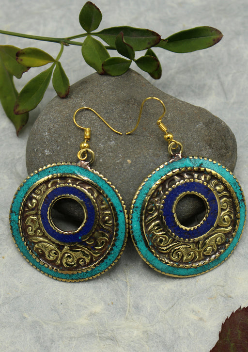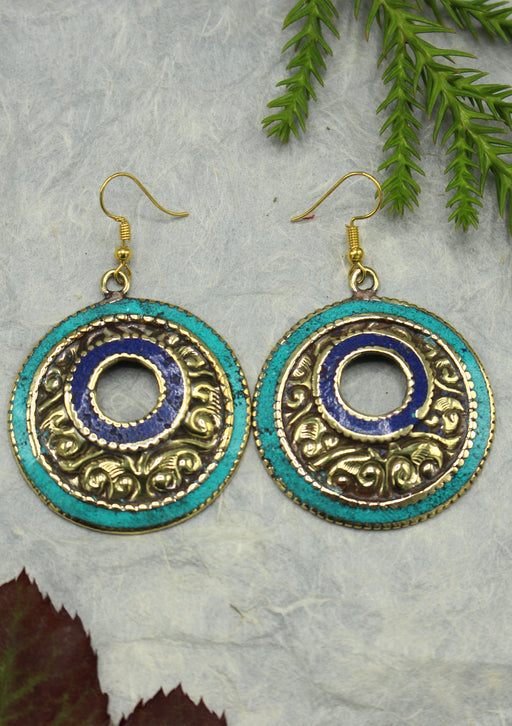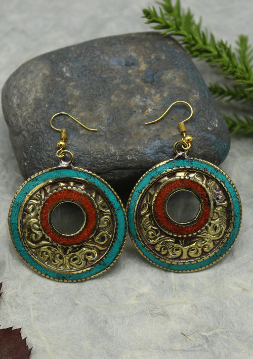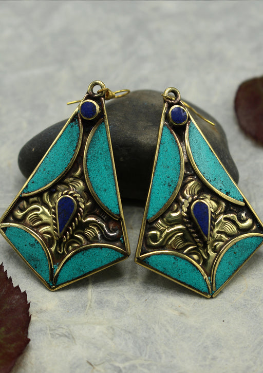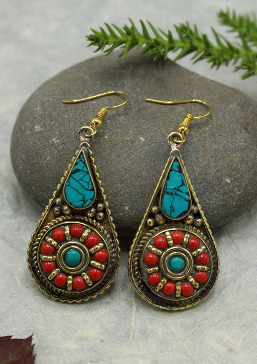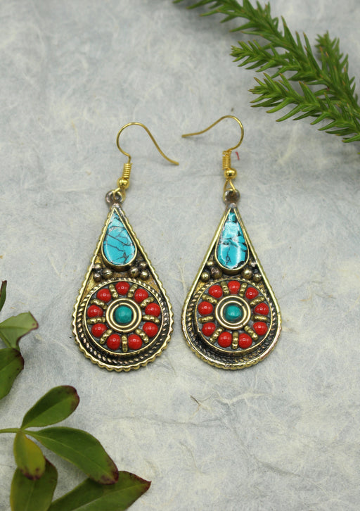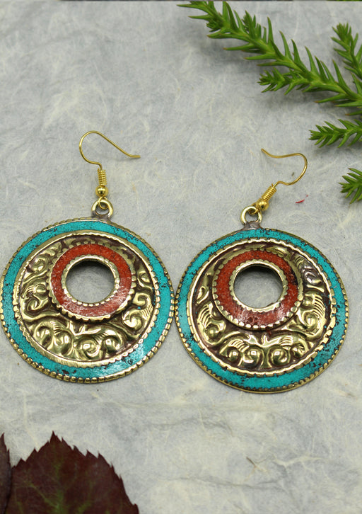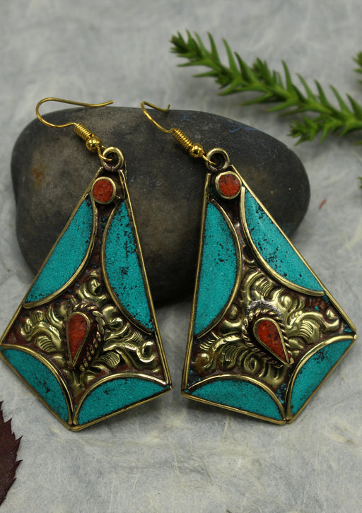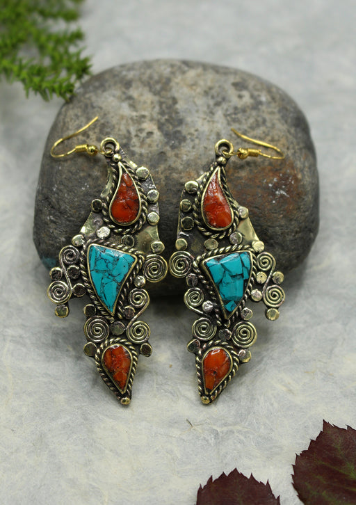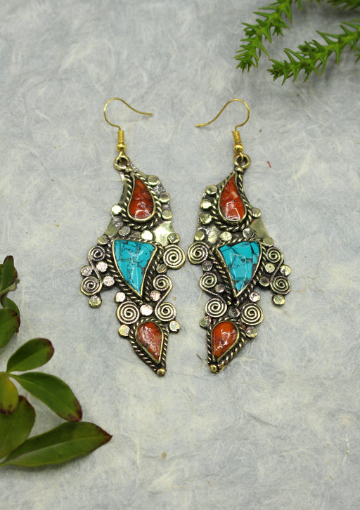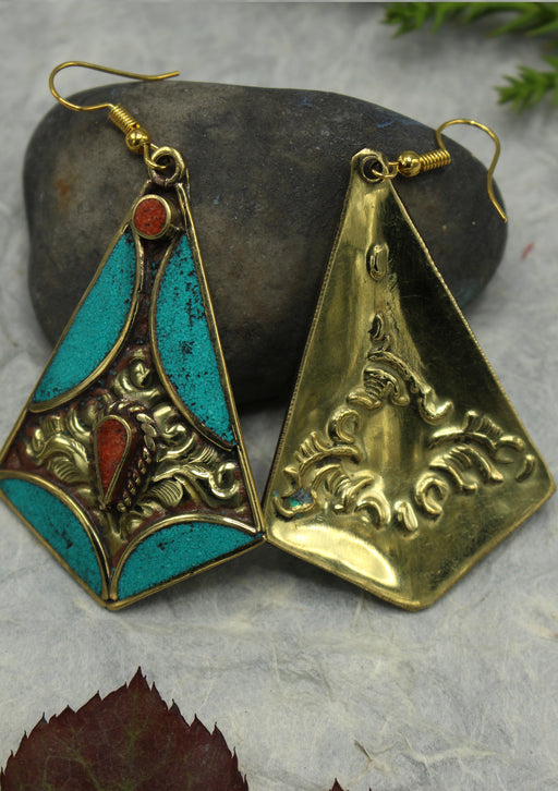 These masterpiece brass earrings are beautifully handmade by the Nepalese artisans. The earrings are inlaid with turquoise and coral . Size: 2....