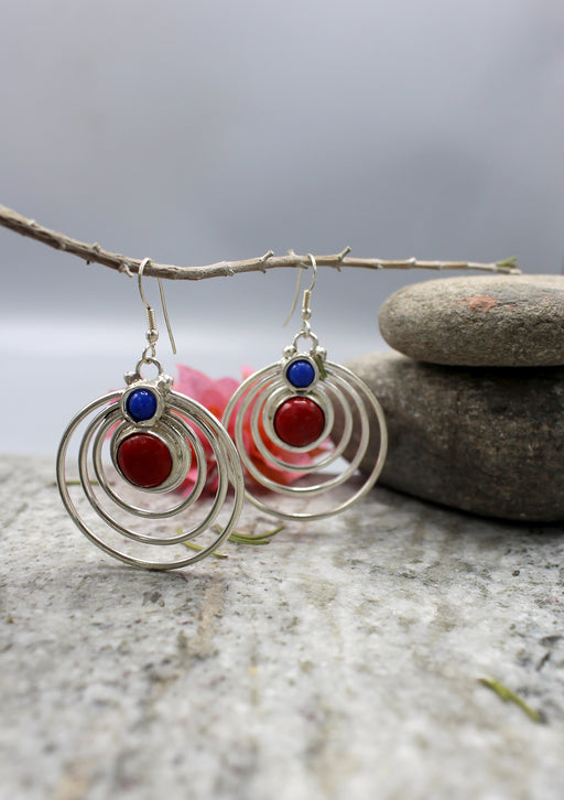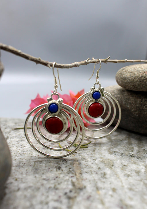 These are the beautifully made Inlaid Coral and Lapis Round white metal earrings. Size: 3.2cm L x 3.2cm B Weight: 13.81 grams approx