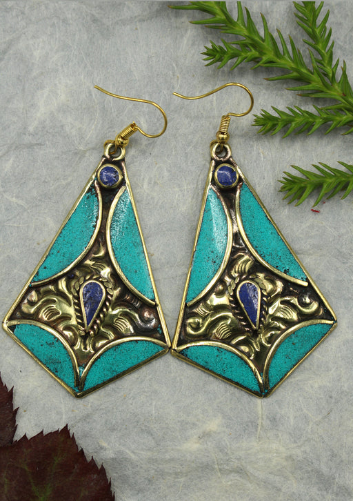 These are the beautifully made brass diamond shaped hook earrings. The earrings are handmade and inlaid with turquoise and lapis resin. Size: 2.4...