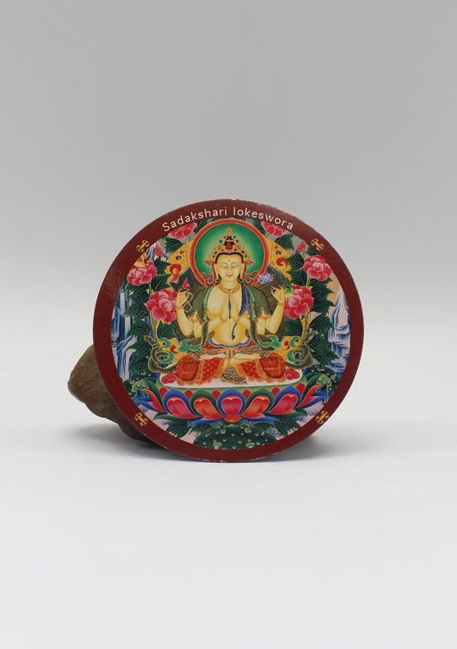 This is a round embossed Chenrezig fridge magnet from Nepal. Fridge magnet are the gift items and they are generally use to clip the important info...