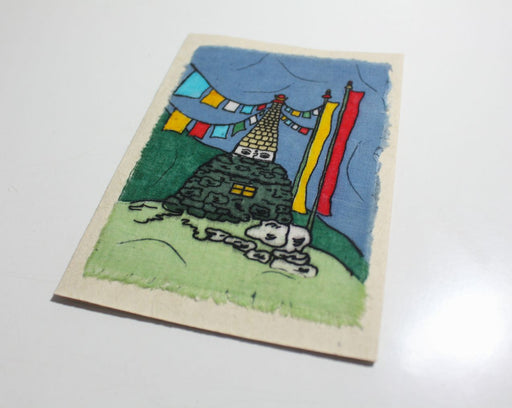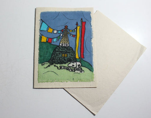 Fair Trade Greeting card with a batik stupa print done on cotton fabric and glued to a lokta paper greeting card. These cards are made by artisans...