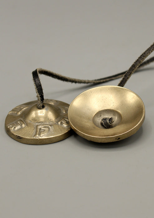This is a Om Mani Padme Hum embossed mini metal tingsha or cymbals. Tingshas are two metal small cymbals joined by leather strap. It is commonly used by Tibetan practitioners during prayers and ritual ceremony. These two metal cymbals are struck together to produce a high pitched clear tone. Thingsha cymbals are quite thick which helps in producing long ringing sounds of a bell.