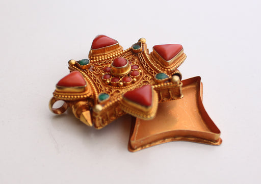 View full detailsGold Plated Silver Sterling Double Dorjee Tibetan Ghau Pendant with Coral Stone