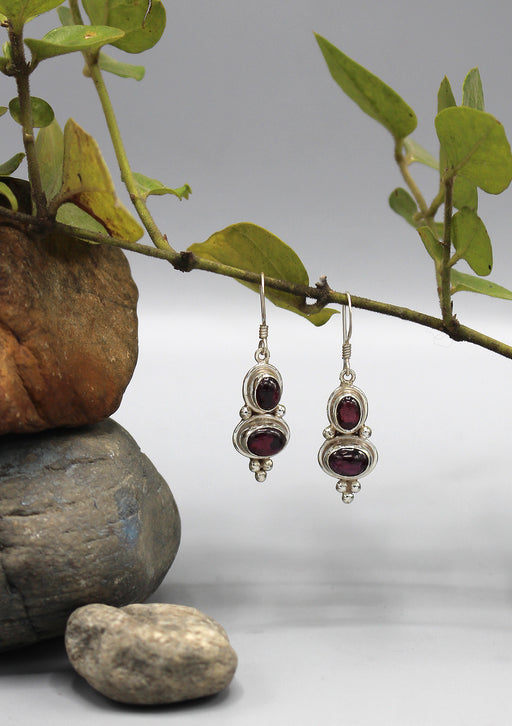 This earrings is made of silver and finely hand carved in Nepal. The earrings is inlaid with Moon stone and Garnet and designed in double drop earr...