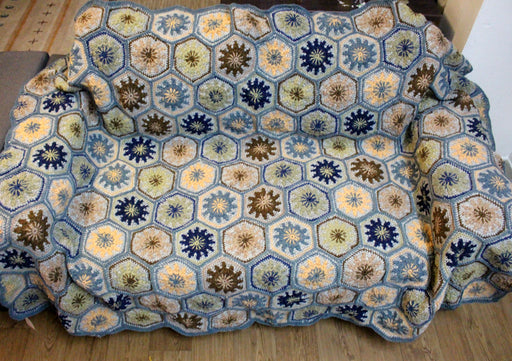View full detailsLarge Hexagon Motif Pattern Hand Crochet Bluish-Gray Edges Multicolor Woolen Blanket