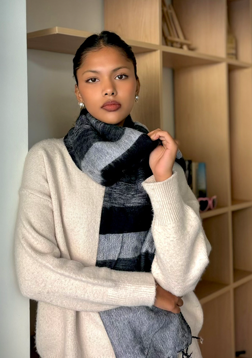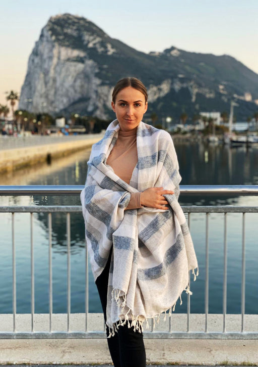 View full detailsBlack Stripe Grey and Off White Yak Wool Shawl