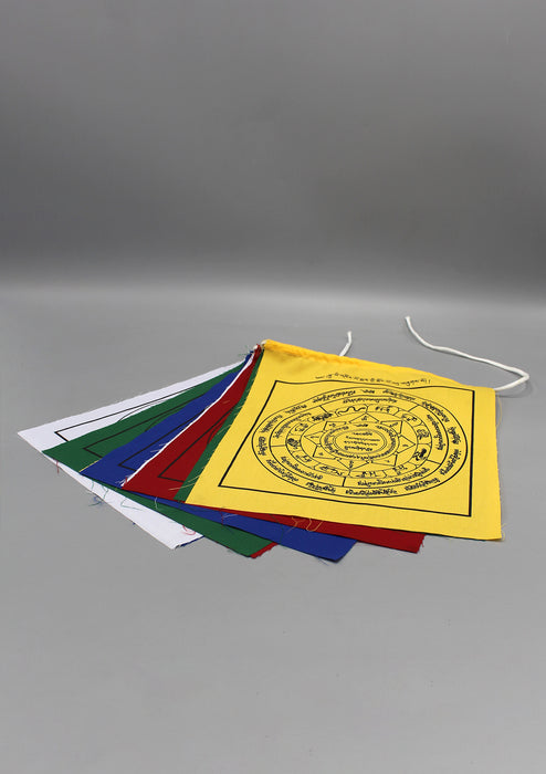 This is a printed Tibetan Astrology Jyoti Chakra Wheel Prayer flag which features Tibetan astrology calendar in the middle.