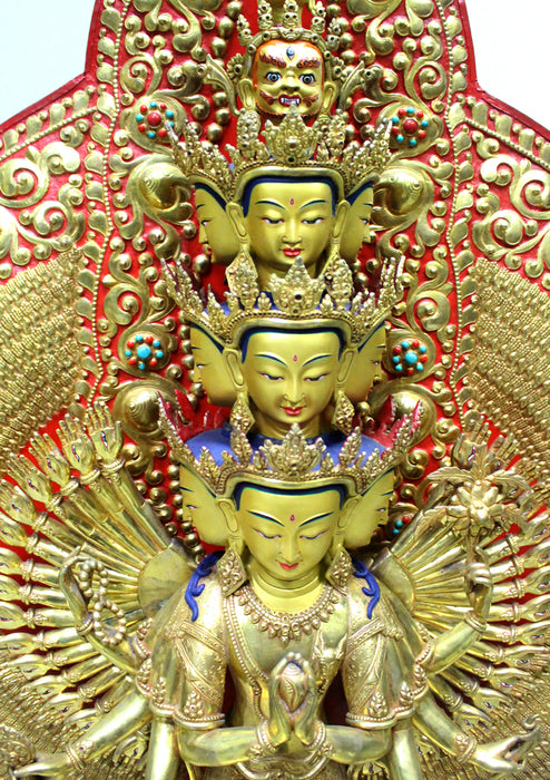 This is a artistically beautiful gold plated Avalokiteshvara statue handmade in Nepal. This statue is made by the fourth generation artist who has invested a huge amount of talent and time making this intricately carved and skillfully made statue.