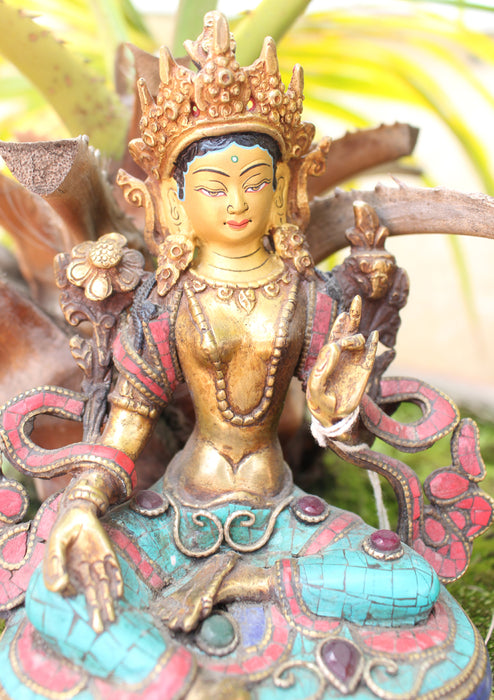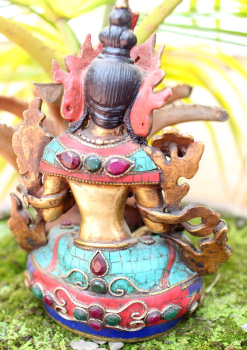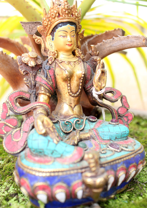 This is a Brass Green Tara Statue with a majestic robe made of faux Turquoise, Coral and Lapis Chips. This statue is 6.1" high. The face of Green Tara is gold plated.