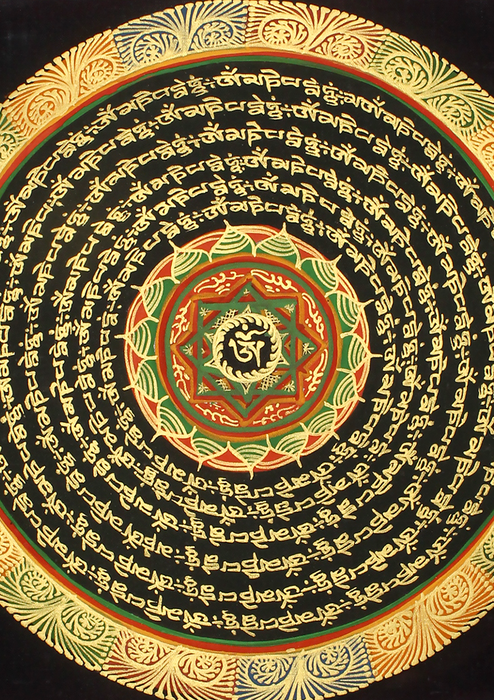 This is a 6 Line Tibetan Om Mandala Thangka Painting. It is hand drawn on primed cotton canvas using mineral and vegetable pigments.