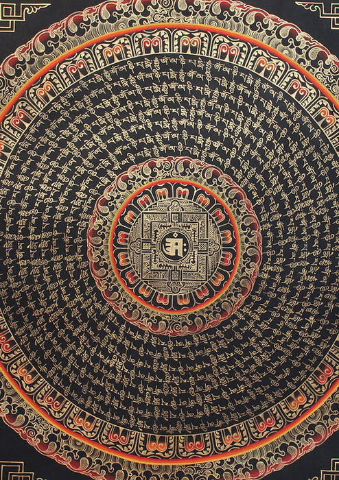 Here, a beautiful Tibetan Om is painted in the middle and surrounded by 8 Line Tibetan mantras. The black cotton canvas with golden color painting is the perfect color combination.