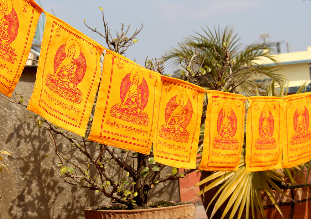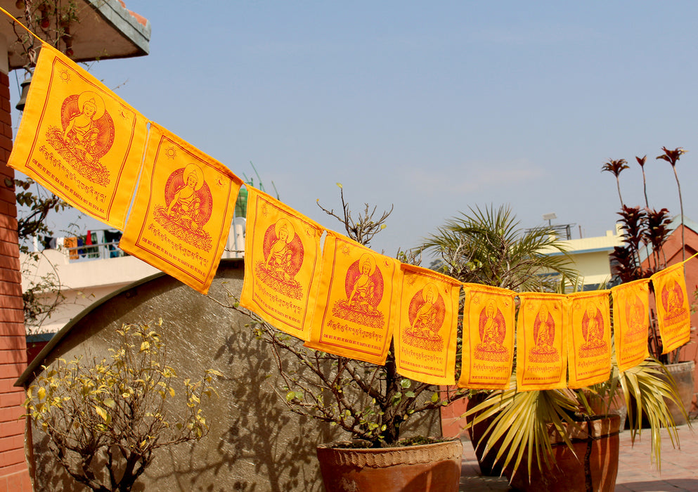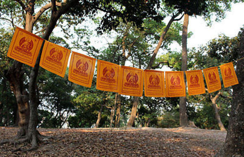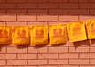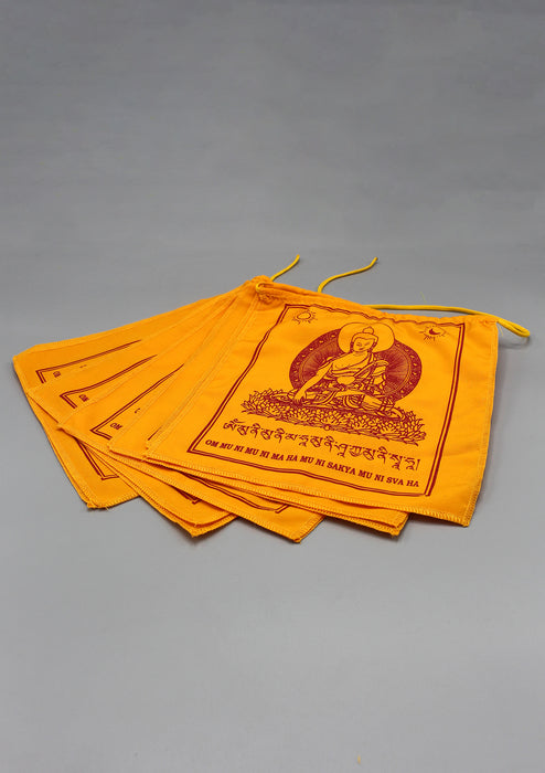 This is an exclusive all orange 10 sheets Tibetan Prayer Flag with Shakyamuni Buddha and his mantra print. This is exclusive because it has all 10 orange flags with the same printing of Buddha and his mantra. Each sheet is sewed at the borders using interlock sewing machines to stop the loose strings of fabric falling off. It increases the durability of the fabric and also it sways much nicely in the air. The mantra that is printed is as follows: