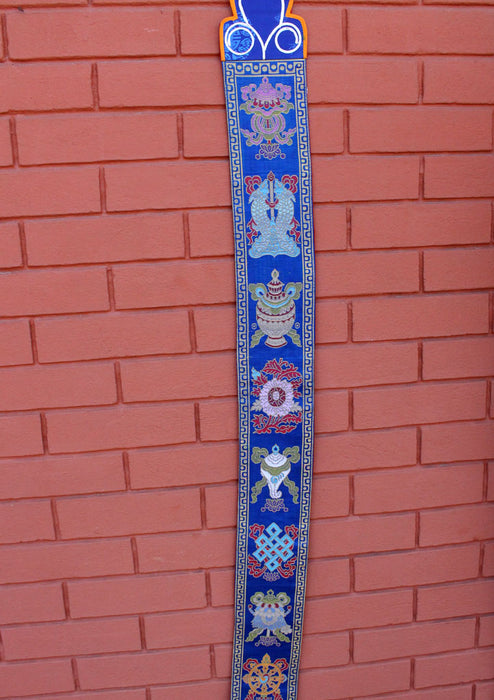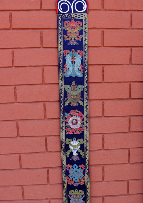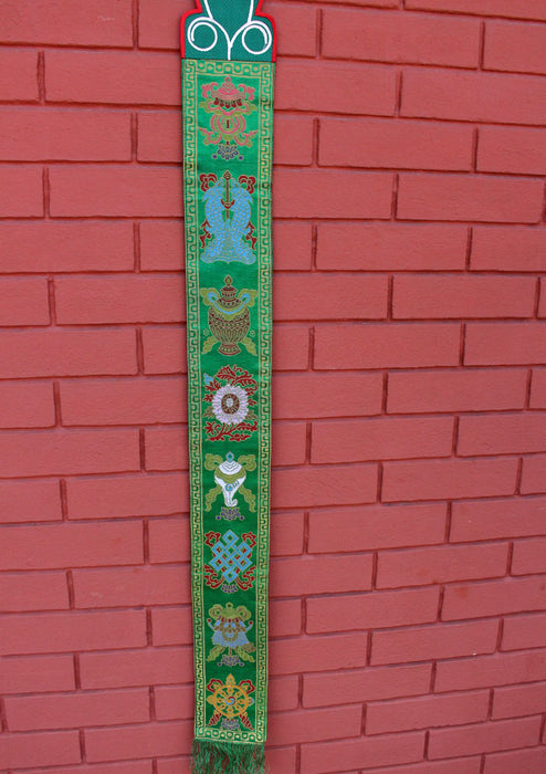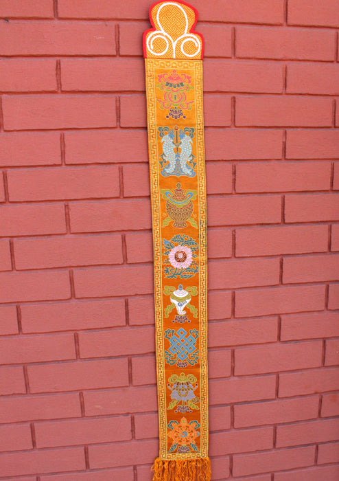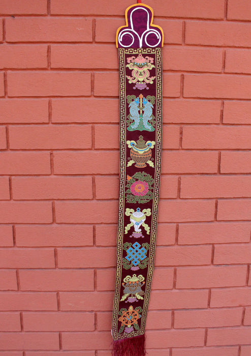This is a beautiful rectangular Religious Tibetan Wall Hanging Banner. The Banner is made of silk brocade and is embroidered with Tibetan Eight Auspicious Symbols. These banners are mostly placed around the altar area or living room.