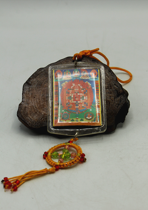 This is a car hanging protection amulet with Atisha Stupa. This amulet hanging is to be hanged in the real view mirror. This amulet has a small picture of Atisha Stupa placed above a paper folded into many folds and wrapped by the five element colors Red, Blue, White, Yellow and Green and is covered with hard plastic cover.